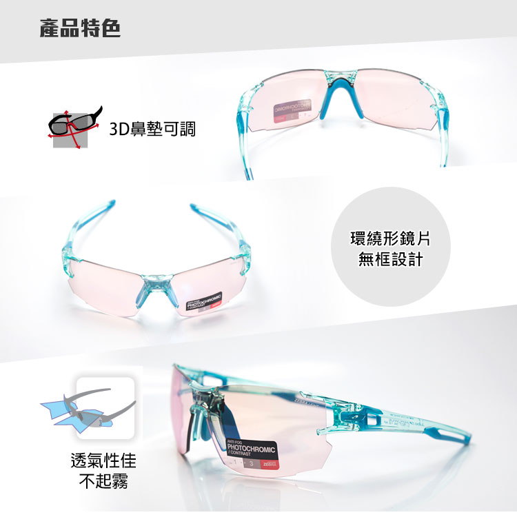◆ 環繞形鏡片無框設計 ◆ 3D鼻墊可調 鏡架通風設計 ◆ 弧形鏡腳戴臉或頭上都舒適 ◆ 透氣性佳不起霧 ◆ 法國品牌NXT鏡片科技
