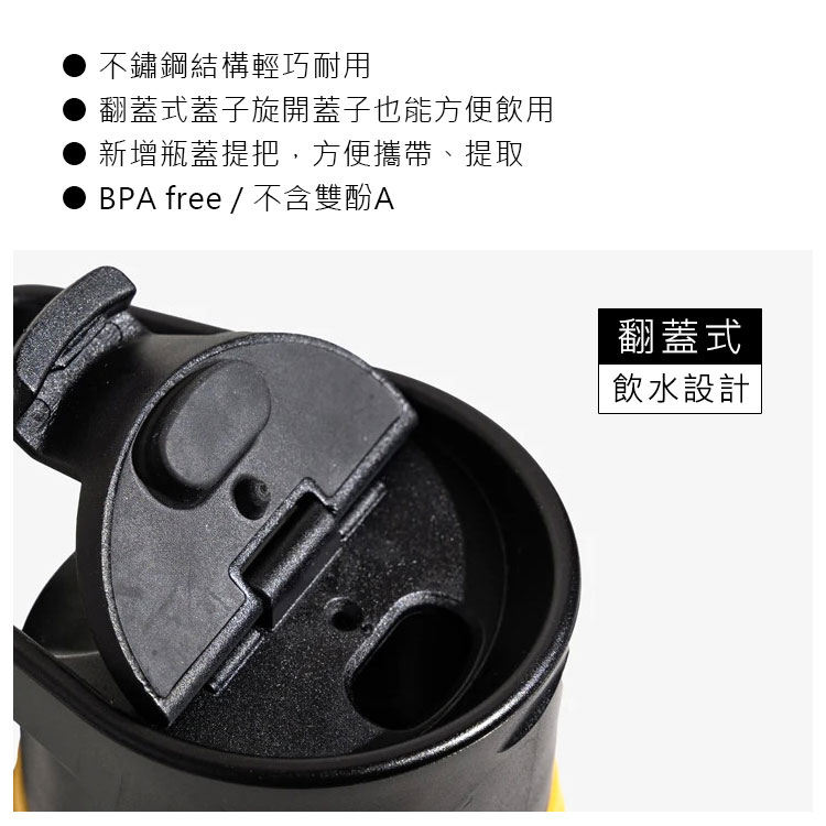 不鏽鋼結構輕巧耐用 翻蓋式蓋子旋開蓋子也能方便飲用 新增瓶蓋提把,方便攜帶、提取 附織帶扣,提取方便 BPA free / 不含雙酚A 雙重絕緣耐用不鏽鋼,保溫12小時、保冷24小時, 瓶蓋能最大程度地提高保持溫度和杯口密度、防止水濺出。