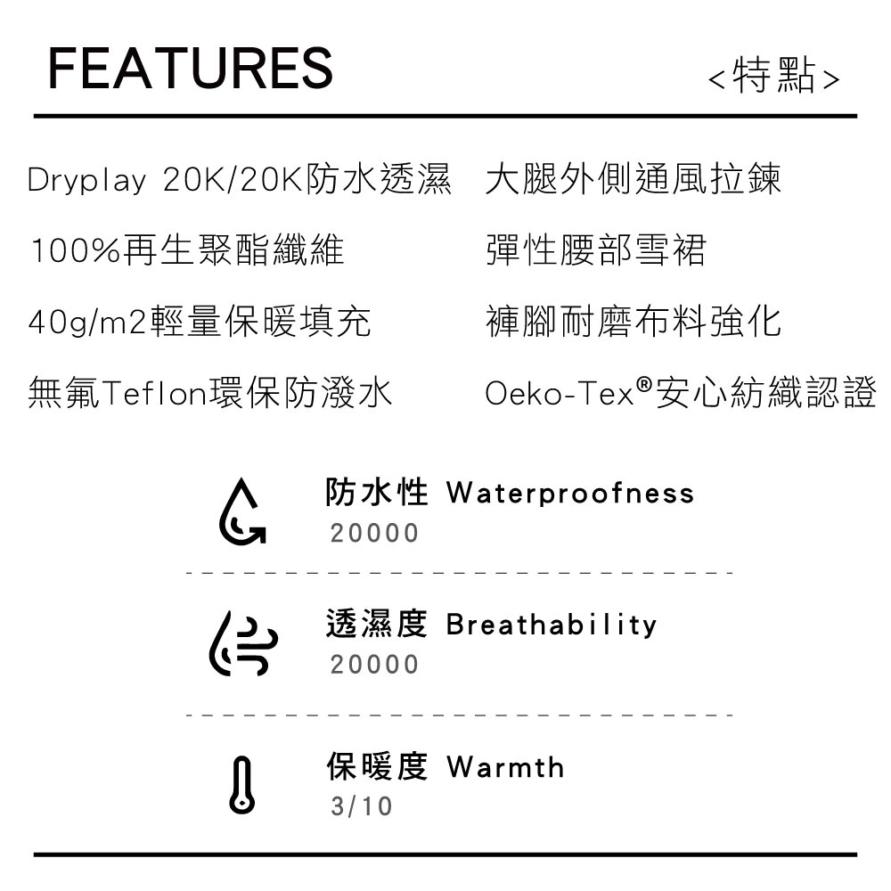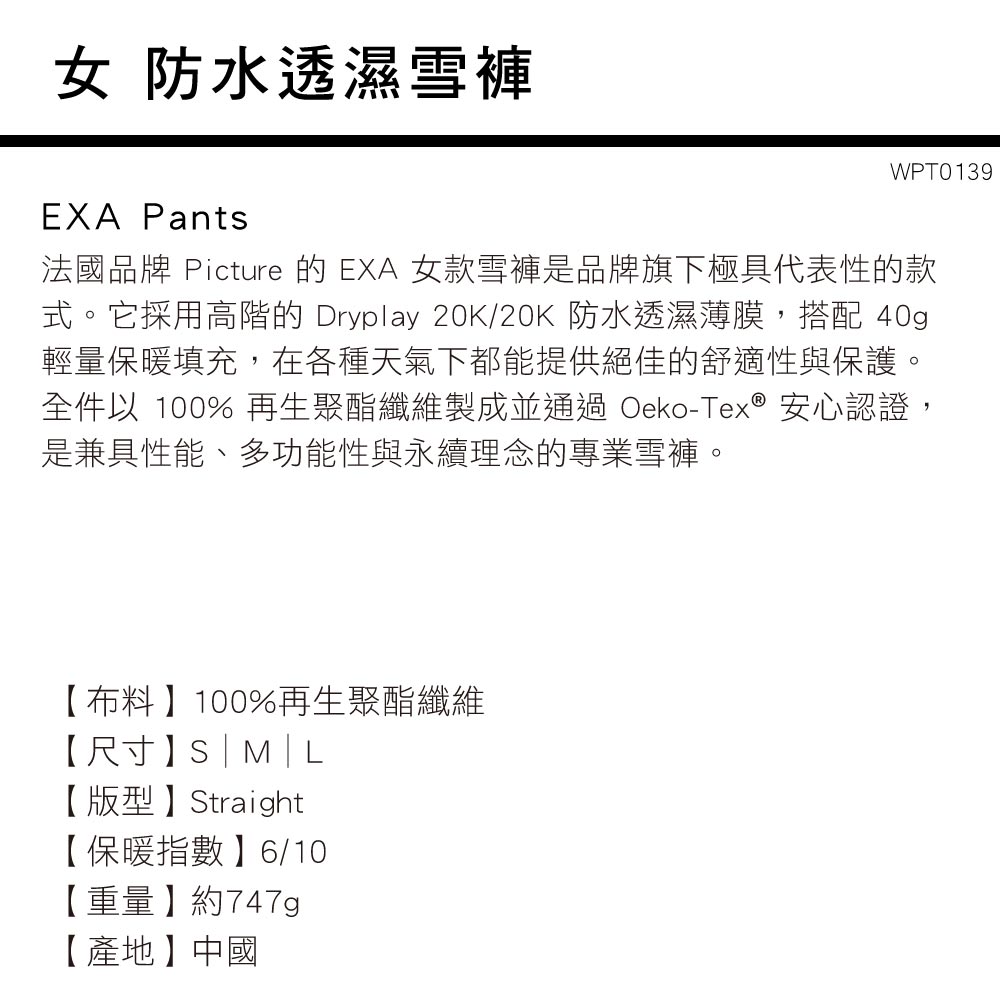 Dryplay 20K防水透濕 100%再生聚酯纖維 40g/m2輕量保暖填充 無氟Teflon環保防潑水 大腿內側通風拉鍊 法國品牌 Picture 的 EXA 女款雪褲是品牌旗下極具代表性的款式。它採用高階的 Dryplay 20K/20K 防水透濕薄膜,搭配 40g 輕量保暖填充,在各種天氣下都能提供絕佳的舒適性與保護。全件以 100% 再生聚酯纖維製成並通過 Oeko-Tex® 安心認證,是兼具性能、多功能性與永續理念的專業雪褲。