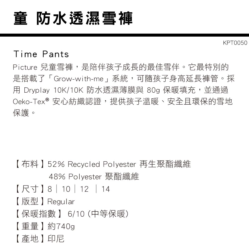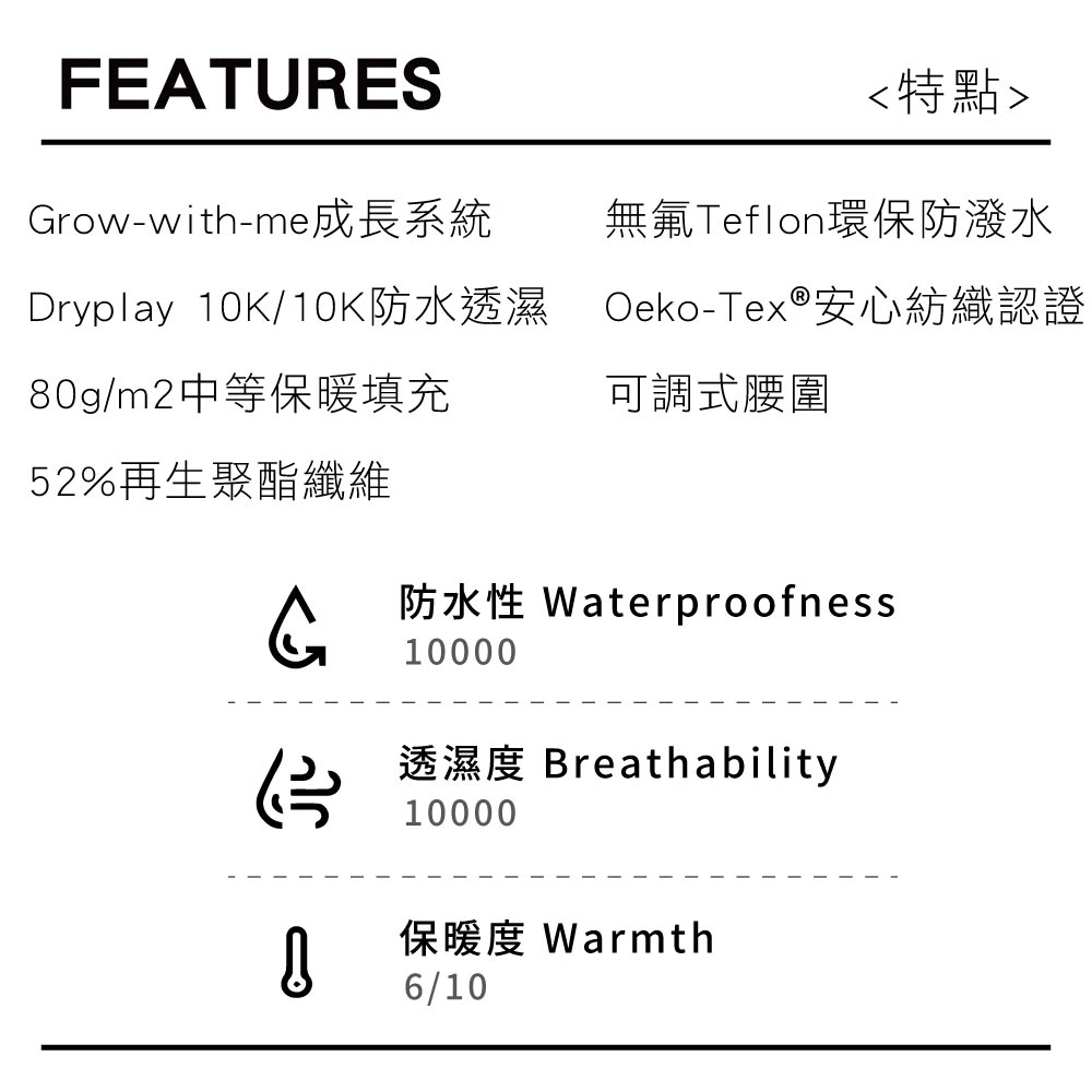 成長系統可延長褲長 10K/10K防水透濕 80g/m2中等保暖填充 無氟Teflon環保防潑水 Oeko-Tex®安心紡織認證 Picture 兒童雪褲,是陪伴孩子成長的最佳雪伴。它最特別的是搭載了「Grow-with-me」系統,可隨孩子身高延長褲管。採用 Dryplay 10K/10K 防水透濕薄膜與 80g 保暖填充,並通過 Oeko-Tex® 安心紡織認證,提供孩子溫暖、安全且環保的雪地保護。
