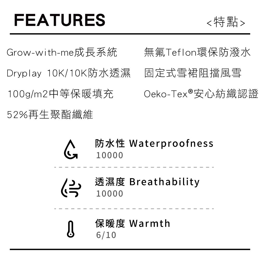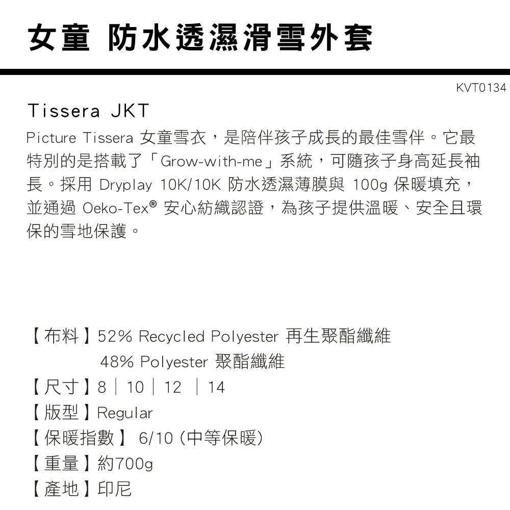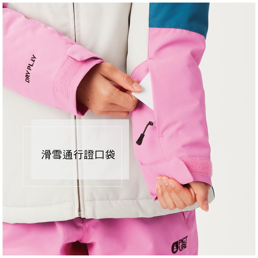 成長系統可延長袖長 10K/10K防水透濕 100g/m2中等保暖填充 無氟Teflon環保防潑水 Oeko-Tex®安心紡織認證 Picture Tissera 女童雪衣,是陪伴孩子成長的最佳雪伴。它最特別的是搭載了「Grow-with-me」系統,可隨孩子身高延長袖長。採用 Dryplay 10K/10K 防水透濕薄膜與 100g 保暖填充,並通過 Oeko-Tex® 安心紡織認證,為孩子提供溫暖、安全且環保的雪地保護。